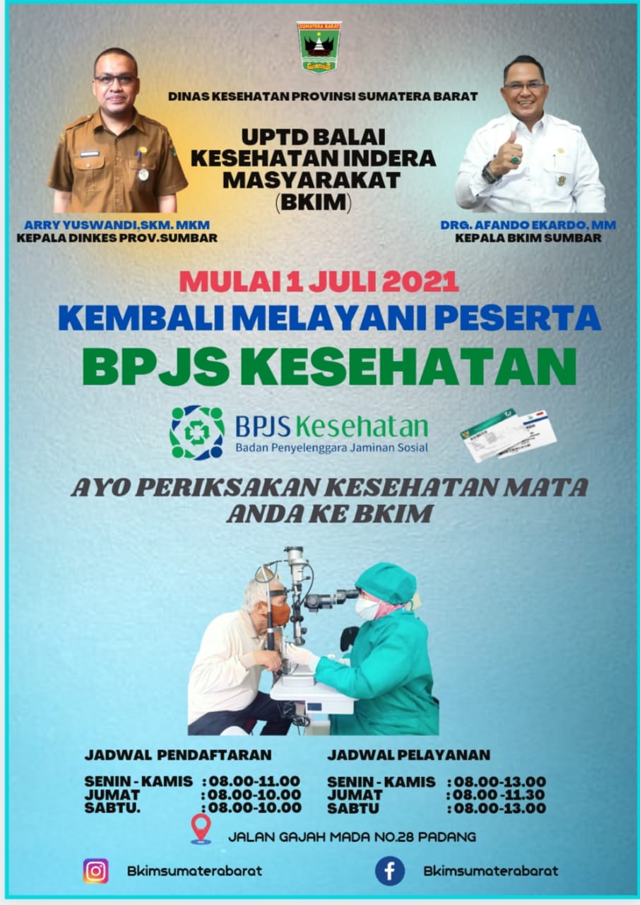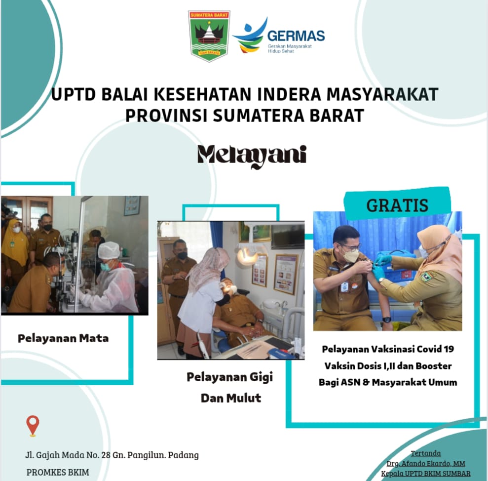 UPTD Balai Kesehatan Indera Masyarakat (BKIM) Dinas Kesehatan Provinsi Sumatera Barat menyediakan beberapa pelayanan, seperti pelayanan Mata, Gigi, Tht. Selain itu UPTD BKIM juga menerima pelayanan Vaksinasi Covid 19.
